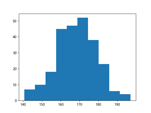 # 以下三行代码使编译器支持绘图功能: import sys import matplotlib matplotlib.use('Agg') import matplotlib.pyplot as plt import numpy as np # 生成正态分布数据: x = np.random.normal(170, 10, 250) # 均值 170,标准差 10,250 个数据点 # 绘制直方图: plt.hist(x) # 创建直方图 plt.show() # 显示图表 # 以下两行代码使编译器能够输出图形: plt.savefig(sys.stdout.buffer) sys.stdout.flush()