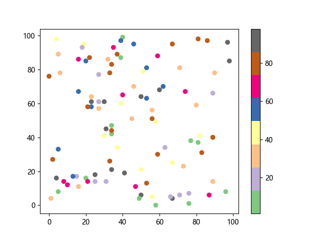 # 这三行代码使编译器能够绘图: import sys import matplotlib matplotlib.use('Agg') import matplotlib.pyplot as plt import numpy as np x = np.random.randint(100, size=(100)) y = np.random.randint(100, size=(100)) colors = np.random.randint(100, size=(100)) # 使用强调色系绘制散点图: plt.scatter(x, y, c=colors, cmap='Accent') plt.colorbar() plt.show() # 这两行代码使编译器能够输出图形: plt.savefig(sys.stdout.buffer) sys.stdout.flush()