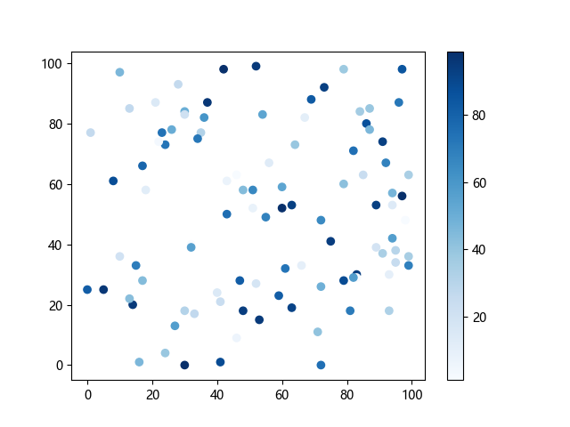 # 这三行代码使编译器能够绘图: import sys import matplotlib matplotlib.use('Agg') import matplotlib.pyplot as plt import numpy as np x = np.random.randint(100, size=(100)) y = np.random.randint(100, size=(100)) colors = np.random.randint(100, size=(100)) # 使用蓝色渐变绘制散点图: plt.scatter(x, y, c=colors, cmap='Blues') plt.colorbar() # 显示颜色条 plt.show() # 显示图形 # 这两行代码使编译器能够输出图形: plt.savefig(sys.stdout.buffer) sys.stdout.flush()