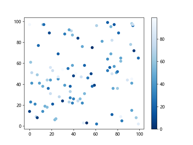 # 这三行代码使编译器能够绘图: import sys import matplotlib matplotlib.use('Agg') import matplotlib.pyplot as plt import numpy as np x = np.random.randint(100, size=(100)) y = np.random.randint(100, size=(100)) colors = np.random.randint(100, size=(100)) # 使用反向蓝色渐变绘制散点图: plt.scatter(x, y, c=colors, cmap='Blues_r') plt.colorbar() # 显示颜色条 plt.show() # 显示图形 # 这两行代码使编译器能够输出图形: plt.savefig(sys.stdout.buffer) sys.stdout.flush()