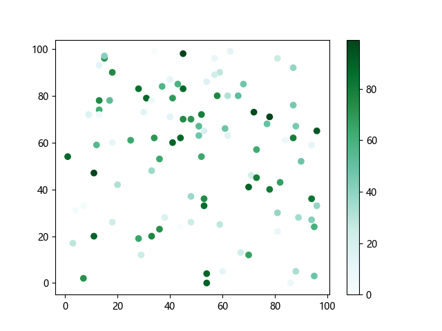 # 这三行代码使编译器能够绘图: import sys import matplotlib matplotlib.use('Agg') import matplotlib.pyplot as plt import numpy as np x = np.random.randint(100, size=(100)) y = np.random.randint(100, size=(100)) colors = np.random.randint(100, size=(100)) # 使用蓝绿色渐变绘制散点图: plt.scatter(x, y, c=colors, cmap='BuGn') plt.colorbar() # 显示颜色条 plt.show() # 显示图形 # 这两行代码使编译器能够输出图形: plt.savefig(sys.stdout.buffer) sys.stdout.flush()