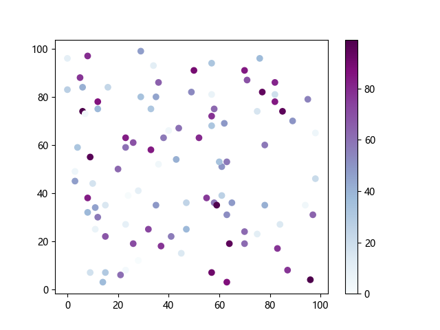 # 这三行代码使编译器能够绘图: import sys import matplotlib matplotlib.use('Agg') import matplotlib.pyplot as plt import numpy as np x = np.random.randint(100, size=(100)) y = np.random.randint(100, size=(100)) colors = np.random.randint(100, size=(100)) # 使用蓝紫色渐变绘制散点图: plt.scatter(x, y, c=colors, cmap='BuPu') plt.colorbar() # 显示颜色条 plt.show() # 显示图形 # 这两行代码使编译器能够输出图形: plt.savefig(sys.stdout.buffer) sys.stdout.flush()