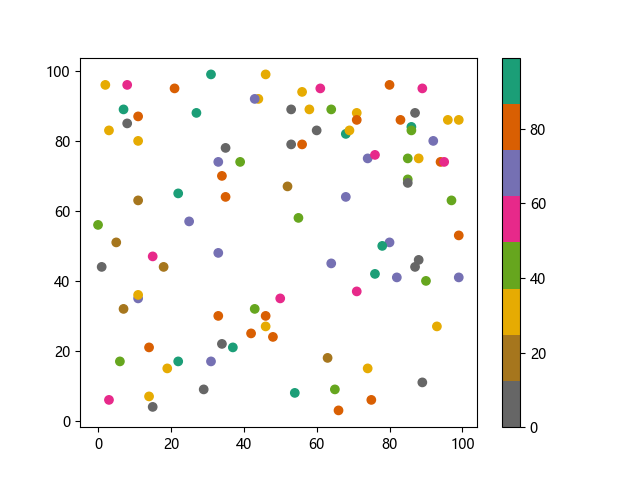 # 这三行代码使编译器能够绘图: import sys import matplotlib matplotlib.use('Agg') import matplotlib.pyplot as plt import numpy as np x = np.random.randint(100, size=(100)) y = np.random.randint(100, size=(100)) colors = np.random.randint(100, size=(100)) # 使用反向 Dark2 配色方案绘制散点图: plt.scatter(x, y, c=colors, cmap='Dark2_r') plt.colorbar() plt.show() # 这两行代码使编译器能够输出图形: plt.savefig(sys.stdout.buffer) sys.stdout.flush()