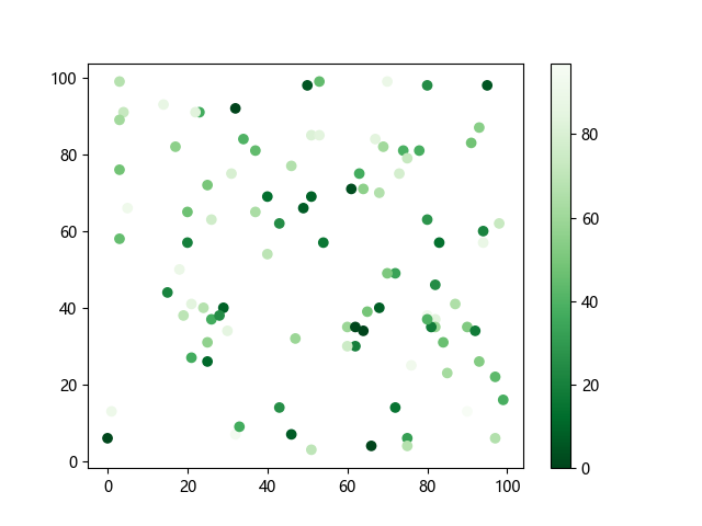 # 这三行代码使编译器能够绘图: import sys import matplotlib matplotlib.use('Agg') import matplotlib.pyplot as plt import numpy as np x = np.random.randint(100, size=(100)) y = np.random.randint(100, size=(100)) colors = np.random.randint(100, size=(100)) # 使用反向绿色渐变绘制散点图: plt.scatter(x, y, c=colors, cmap='Greens_r') plt.colorbar() plt.show() # 这两行代码使编译器能够输出图形: plt.savefig(sys.stdout.buffer) sys.stdout.flush()