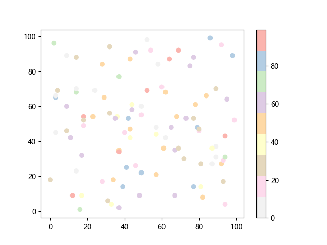 # 这三行代码使编译器能够绘图: import sys import matplotlib matplotlib.use('Agg') import matplotlib.pyplot as plt import numpy as np x = np.random.randint(100, size=(100)) y = np.random.randint(100, size=(100)) colors = np.random.randint(100, size=(100)) # 绘制反向 Pastel1 配色方案的散点图: plt.scatter(x, y, c=colors, cmap='Pastel1_r') plt.colorbar() plt.show() # 这两行代码使编译器能够输出图形: plt.savefig(sys.stdout.buffer) sys.stdout.flush()