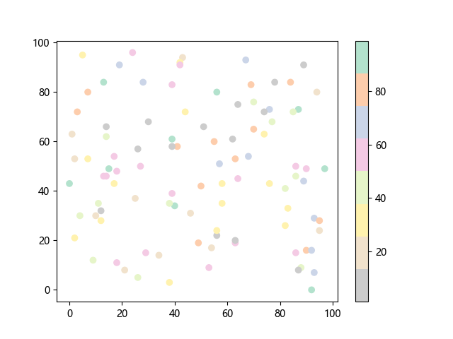 # 这三行代码使编译器能够绘图: import sys import matplotlib matplotlib.use('Agg') import matplotlib.pyplot as plt import numpy as np # 生成 100 个随机 x 坐标: x = np.random.randint(100, size=(100)) # 生成 100 个随机 y 坐标: y = np.random.randint(100, size=(100)) # 生成 100 个随机颜色值: colors = np.random.randint(100, size=(100)) # 绘制彩色散点图 plt.scatter(x, y, c=colors, cmap='Pastel2_r') plt.colorbar() # 显示颜色条 plt.show() # 显示图形 # 这两行代码使编译器能够输出图形: plt.savefig(sys.stdout.buffer) sys.stdout.flush()