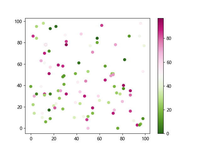 # 这三行代码使编译器能够绘图: import sys import matplotlib matplotlib.use('Agg') import matplotlib.pyplot as plt import numpy as np # 生成随机数据: x = np.random.randint(100, size=(100)) y = np.random.randint(100, size=(100)) colors = np.random.randint(100, size=(100)) # 使用 PiYG_r 配色方案绘制粉绿反向渐变色散点图: plt.scatter(x, y, c=colors, cmap='PiYG_r') plt.colorbar() # 显示颜色条 plt.show() # 显示图形 # 这两行代码使编译器能够输出图形: plt.savefig(sys.stdout.buffer) sys.stdout.flush()