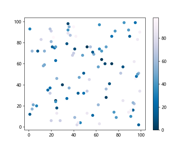 # 这三行代码使编译器能够绘图: import sys import matplotlib matplotlib.use('Agg') import matplotlib.pyplot as plt import numpy as np # 生成随机数据: x = np.random.randint(100, size=(100)) y = np.random.randint(100, size=(100)) colors = np.random.randint(100, size=(100)) # 使用 PuBu_r 配色方案绘制紫蓝色反向渐变色散点图: plt.scatter(x, y, c=colors, cmap='PuBu_r') plt.colorbar() # 显示颜色条 plt.show() # 显示图形 # 这两行代码使编译器能够输出图形: plt.savefig(sys.stdout.buffer) sys.stdout.flush()