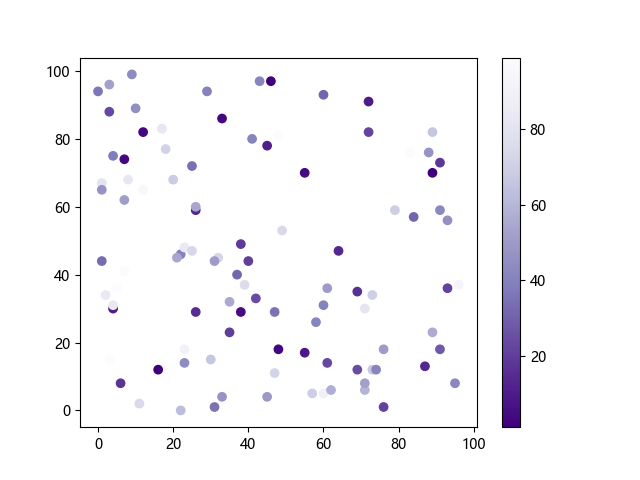 # 这三行代码使编译器能够绘图: import sys import matplotlib matplotlib.use('Agg') import matplotlib.pyplot as plt import numpy as np # 生成随机数据: x = np.random.randint(100, size=(100)) y = np.random.randint(100, size=(100)) colors = np.random.randint(100, size=(100)) # 使用 Purples_r 配色方案绘制紫色反向渐变色散点图: plt.scatter(x, y, c=colors, cmap='Purples_r') plt.colorbar() # 显示颜色条 plt.show() # 显示图形 # 这两行代码使编译器能够输出图形: plt.savefig(sys.stdout.buffer) sys.stdout.flush()