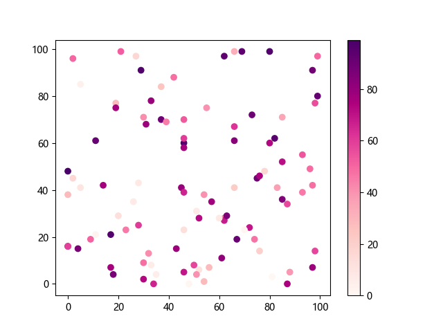 # 这三行代码使编译器能够绘图: import sys import matplotlib matplotlib.use('Agg') import matplotlib.pyplot as plt import numpy as np # 生成随机数据 x = np.random.randint(100, size=(100)) y = np.random.randint(100, size=(100)) colors = np.random.randint(100, size=(100)) # 使用 RdPu 配色方案绘制红紫色渐变色散点图: plt.scatter(x, y, c=colors, cmap='RdPu') plt.colorbar() # 显示颜色条 plt.show() # 显示图形 # 这两行代码使编译器能够输出图形: plt.savefig(sys.stdout.buffer) sys.stdout.flush()