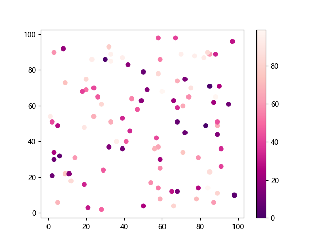 # 这三行代码使编译器能够绘图: import sys import matplotlib matplotlib.use('Agg') import matplotlib.pyplot as plt import numpy as np # 生成随机数据: x = np.random.randint(100, size=(100)) y = np.random.randint(100, size=(100)) colors = np.random.randint(100, size=(100)) # 使用 RdPu_r 配色方案绘制红紫色反向渐变色散点图: plt.scatter(x, y, c=colors, cmap='RdPu_r') plt.colorbar() # 显示颜色条 plt.show() # 显示图形 # 这两行代码使编译器能够输出图形: plt.savefig(sys.stdout.buffer) sys.stdout.flush()