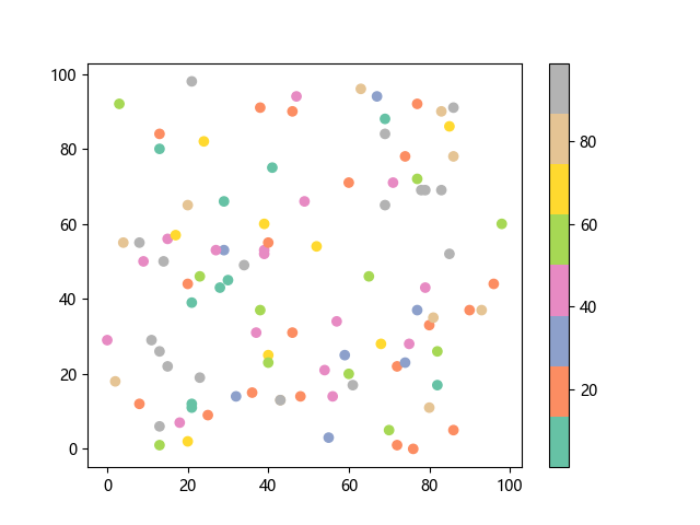 # 这三行代码使编译器能够绘图: import sys import matplotlib matplotlib.use('Agg') import matplotlib.pyplot as plt import numpy as np # 生成随机数据: x = np.random.randint(100, size=(100)) y = np.random.randint(100, size=(100)) colors = np.random.randint(100, size=(100)) # 使用 Set2 (8 色调色板)配色方案绘制 Set2 离散色散点图: plt.scatter(x, y, c=colors, cmap='Set2') plt.colorbar() # 显示颜色条 plt.show() # 显示图形 # 这两行代码使编译器能够输出图形: plt.savefig(sys.stdout.buffer) sys.stdout.flush()