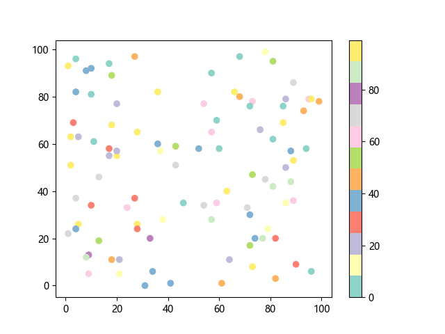 # 这三行代码使编译器能够绘图: import sys import matplotlib matplotlib.use('Agg') import matplotlib.pyplot as plt import numpy as np # 生成随机数据: x = np.random.randint(100, size=(100)) y = np.random.randint(100, size=(100)) colors = np.random.randint(100, size=(100)) # 使用 Set3 (12 色调色板)配色方案绘制 Set3 离散色散点图: plt.scatter(x, y, c=colors, cmap='Set3') plt.colorbar() # 显示颜色条 plt.show() # 显示图形 # 这两行代码使编译器能够输出图形: plt.savefig(sys.stdout.buffer) sys.stdout.flush()