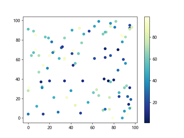 # 这三行代码使编译器能够绘图: import sys import matplotlib matplotlib.use('Agg') import matplotlib.pyplot as plt import numpy as np # 生成随机数据点: x = np.random.randint(100, size=(100)) y = np.random.randint(100, size=(100)) colors = np.random.randint(100, size=(100)) # 使用 YlGnBu_r (黄-绿-蓝反向渐变)配色方案绘制散点图: plt.scatter(x, y, c=colors, cmap='YlGnBu_r') plt.colorbar() # 显示颜色条 plt.show() # 显示图形 # 这两行代码使编译器能够输出图形: plt.savefig(sys.stdout.buffer) sys.stdout.flush()