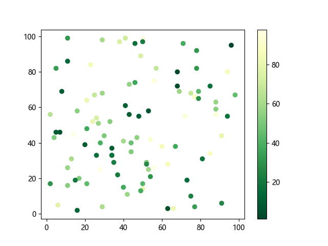 # 这三行代码使编译器能够绘图: import sys import matplotlib matplotlib.use('Agg') import matplotlib.pyplot as plt import numpy as np # 生成随机数据: x = np.random.randint(100, size=(100)) y = np.random.randint(100, size=(100)) colors = np.random.randint(100, size=(100)) # 使用YlGn_r(黄-绿反向渐变)配色方案绘制散点图: plt.scatter(x, y, c=colors, cmap='YlGn_r') plt.colorbar() # 显示颜色条 plt.show() # 显示图形 # 这两行代码使编译器能够输出图形: plt.savefig(sys.stdout.buffer) sys.stdout.flush()