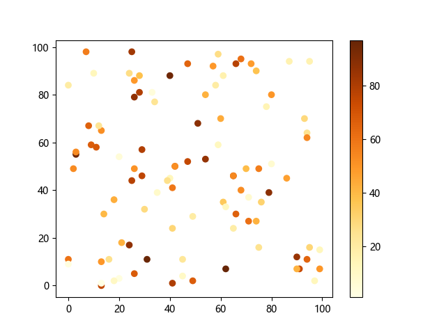 # 这三行代码使编译器能够绘图: import sys import matplotlib matplotlib.use('Agg') import matplotlib.pyplot as plt import numpy as np # 生成随机数据: x = np.random.randint(100, size=(100)) y = np.random.randint(100, size=(100)) colors = np.random.randint(100, size=(100)) # 使用 YlOrBr (黄-橙-棕渐变)配色方案绘制黄橙棕渐变散点图: plt.scatter(x, y, c=colors, cmap='YlOrBr') plt.colorbar() # 显示颜色条 plt.show() # 显示图形 # 这两行代码使编译器能够输出图形: plt.savefig(sys.stdout.buffer) sys.stdout.flush()