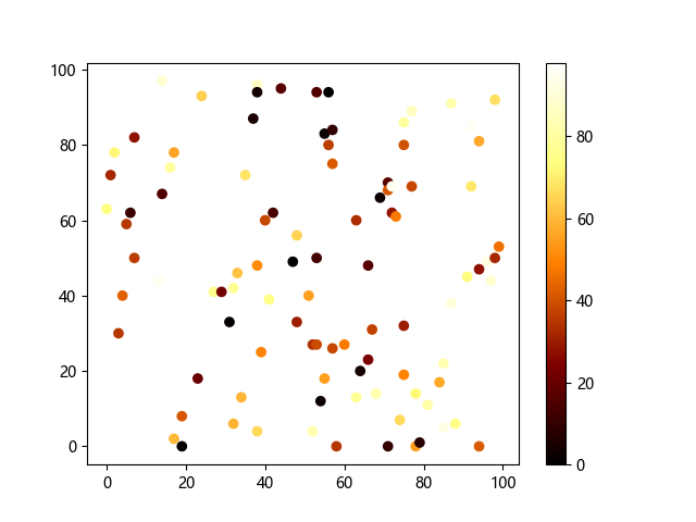 # 这三行代码使编译器能够绘图: import sys import matplotlib matplotlib.use('Agg') import matplotlib.pyplot as plt import numpy as np # 生成随机数据: x = np.random.randint(100, size=(100)) y = np.random.randint(100, size=(100)) colors = np.random.randint(100, size=(100)) # 使用 afmhot (热金属)配色方案绘制热金属色散点图: plt.scatter(x, y, c=colors, cmap='afmhot') plt.colorbar() # 显示颜色条 plt.show() # 显示图形 # 这两行代码使编译器能够输出图形: plt.savefig(sys.stdout.buffer) sys.stdout.flush()