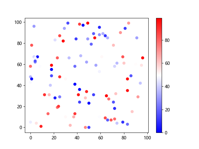 # 这三行代码使编译器能够绘图: import sys import matplotlib matplotlib.use('Agg') import matplotlib.pyplot as plt import numpy as np # 生成随机数据 x = np.random.randint(100, size=(100)) y = np.random.randint(100, size=(100)) colors = np.random.randint(100, size=(100)) # 使用 bwr 配色方案绘制蓝白红渐变色散点图: plt.scatter(x, y, c=colors, cmap='bwr') plt.colorbar() plt.show() # 这两行代码使编译器能够输出图形: plt.savefig(sys.stdout.buffer) sys.stdout.flush()