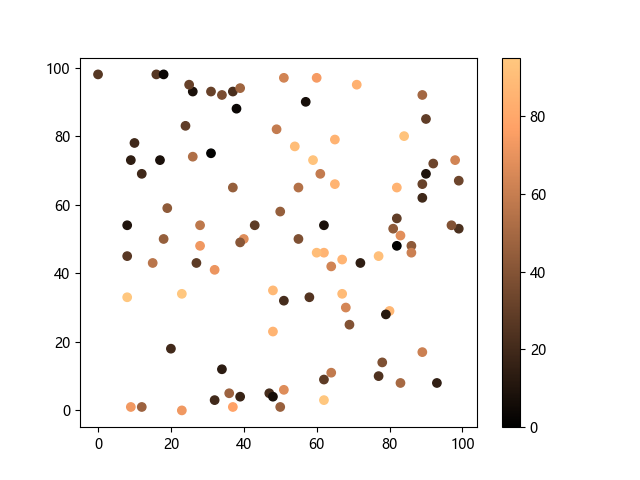 # 这三行代码使编译器能够绘图: import sys import matplotlib matplotlib.use('Agg') import matplotlib.pyplot as plt import numpy as np # 生成随机数据 x = np.random.randint(100, size=(100)) y = np.random.randint(100, size=(100)) colors = np.random.randint(100, size=(100)) # 使用 copper 配色方案绘制铜色渐变色散点图: plt.scatter(x, y, c=colors, cmap='copper') plt.colorbar() plt.show() # 这两行代码使编译器能够输出图形: plt.savefig(sys.stdout.buffer) sys.stdout.flush()