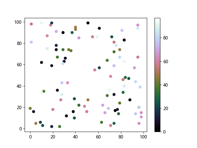 # 这三行代码使编译器能够绘图: import sys import matplotlib matplotlib.use('Agg') import matplotlib.pyplot as plt import numpy as np # 生成随机数据 x = np.random.randint(100, size=(100)) y = np.random.randint(100, size=(100)) colors = np.random.randint(100, size=(100)) # 使用 cubehelix 配色方案绘制螺旋立方体渐变色散点图: plt.scatter(x, y, c=colors, cmap='cubehelix') plt.colorbar() plt.show() # 这两行代码使编译器能够输出图形: plt.savefig(sys.stdout.buffer) sys.stdout.flush()