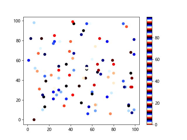 # 这三行代码使编译器能够绘图: import sys import matplotlib matplotlib.use('Agg') import matplotlib.pyplot as plt import numpy as np # 生成随机数据 x = np.random.randint(100, size=(100)) y = np.random.randint(100, size=(100)) colors = np.random.randint(100, size=(100)) # 使用 flag 配色方案绘制旗帜渐变色散点图: plt.scatter(x, y, c=colors, cmap='flag') plt.colorbar() plt.show() # 这两行代码使编译器能够输出图形: plt.savefig(sys.stdout.buffer) sys.stdout.flush()