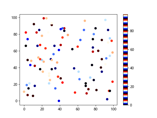 # 这三行代码使编译器能够绘图: import sys import matplotlib matplotlib.use('Agg') import matplotlib.pyplot as plt import numpy as np # 生成随机数据点 x = np.random.randint(100, size=(100)) y = np.random.randint(100, size=(100)) colors = np.random.randint(100, size=(100)) # 使用 flag_r 配色方案绘制旗帜反向渐变色散点图: plt.scatter(x, y, c=colors, cmap='flag_r') plt.colorbar() plt.show() # 这两行代码使编译器能够输出图形: plt.savefig(sys.stdout.buffer) sys.stdout.flush()