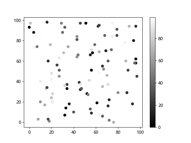 # 这三行代码使编译器能够绘图: import sys import matplotlib matplotlib.use('Agg') import matplotlib.pyplot as plt import numpy as np # 生成随机数据 x = np.random.randint(100, size=(100)) y = np.random.randint(100, size=(100)) colors = np.random.randint(100, size=(100)) # 使用 gist_gray 配色方案绘制灰度渐变色散点图: plt.scatter(x, y, c=colors, cmap='gist_gray') plt.colorbar() plt.show() # 这两行代码使编译器能够输出图形: plt.savefig(sys.stdout.buffer) sys.stdout.flush()