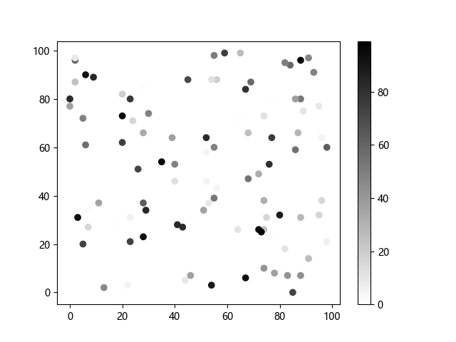 # 这三行代码使编译器能够绘图: import sys import matplotlib matplotlib.use('Agg') import matplotlib.pyplot as plt import numpy as np # 生成随机数据点 x = np.random.randint(100, size=(100)) y = np.random.randint(100, size=(100)) colors = np.random.randint(100, size=(100)) # 使用 gist_gray_r 配色方案绘制灰度反向渐变色散点图: plt.scatter(x, y, c=colors, cmap='gist_gray_r') plt.colorbar() plt.show() # 这两行代码使编译器能够输出图形: plt.savefig(sys.stdout.buffer) sys.stdout.flush()