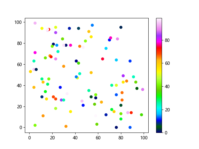 # 这三行代码使编译器能够绘图: import sys import matplotlib matplotlib.use('Agg') import matplotlib.pyplot as plt import numpy as np # 生成随机数据 x = np.random.randint(100, size=(100)) y = np.random.randint(100, size=(100)) colors = np.random.randint(100, size=(100)) # 使用 gist_ncar 配色方案绘制NCAR渐变色散点图: plt.scatter(x, y, c=colors, cmap='gist_ncar') plt.colorbar() plt.show() # 这两行代码使编译器能够输出图形: plt.savefig(sys.stdout.buffer) sys.stdout.flush()