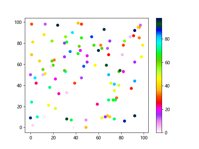# 这三行代码使编译器能够绘图: import sys import matplotlib matplotlib.use('Agg') import matplotlib.pyplot as plt import numpy as np # 生成随机数据点 x = np.random.randint(100, size=(100)) y = np.random.randint(100, size=(100)) colors = np.random.randint(100, size=(100)) # 使用 gist_ncar_r 配色方案绘制 NCAR 反向渐变色散点图: plt.scatter(x, y, c=colors, cmap='gist_ncar_r') plt.colorbar() plt.show() # 这两行代码使编译器能够输出图形: plt.savefig(sys.stdout.buffer) sys.stdout.flush()