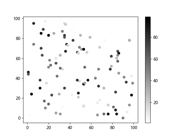 # 这三行代码使编译器能够绘图: import sys import matplotlib matplotlib.use('Agg') import matplotlib.pyplot as plt import numpy as np # 生成随机数据 x = np.random.randint(100, size=(100)) y = np.random.randint(100, size=(100)) colors = np.random.randint(100, size=(100)) # 使用 gist_yarg 配色方案绘制灰度渐变色散点图: plt.scatter(x, y, c=colors, cmap='gist_yarg') plt.colorbar() plt.show() # 这两行代码使编译器能够输出图形: plt.savefig(sys.stdout.buffer) sys.stdout.flush()