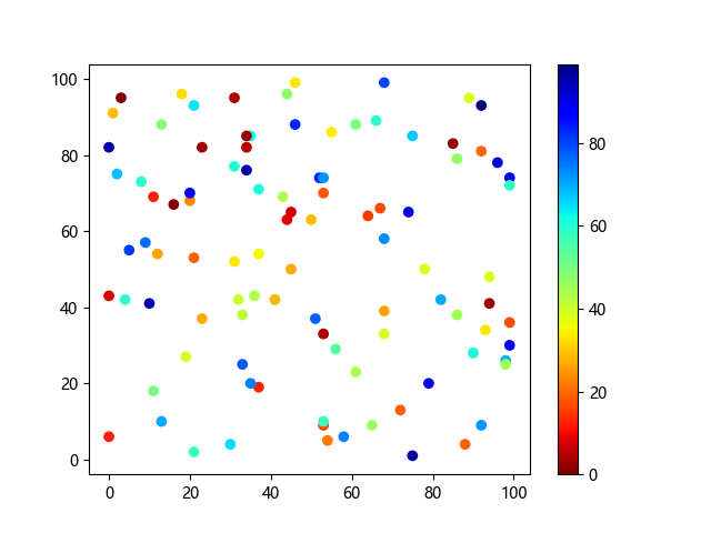 # 这三行代码使编译器能够绘图: import sys import matplotlib matplotlib.use('Agg') import matplotlib.pyplot as plt import numpy as np # 生成随机数据点 x = np.random.randint(100, size=(100)) y = np.random.randint(100, size=(100)) colors = np.random.randint(100, size=(100)) # 使用 jet_r 配色方案绘制 Jet 反向渐变色散点图: plt.scatter(x, y, c=colors, cmap='jet_r') plt.colorbar() plt.show() # 这两行代码使编译器能够输出图形: plt.savefig(sys.stdout.buffer) sys.stdout.flush()