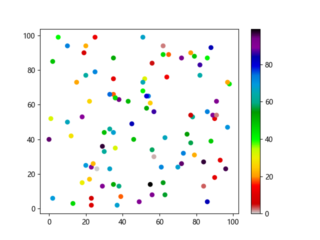 #Three lines to make our compiler able to draw: import sys import matplotlib matplotlib.use('Agg') import matplotlib.pyplot as plt import numpy as np x = np.random.randint(100, size=(100)) y = np.random.randint(100, size=(100)) colors = np.random.randint(100, size=(100)) plt.scatter(x, y, c=colors, cmap='nipy_spectral_r') plt.colorbar() plt.show() #Two lines to make our compiler able to draw: plt.savefig(sys.stdout.buffer) sys.stdout.flush()