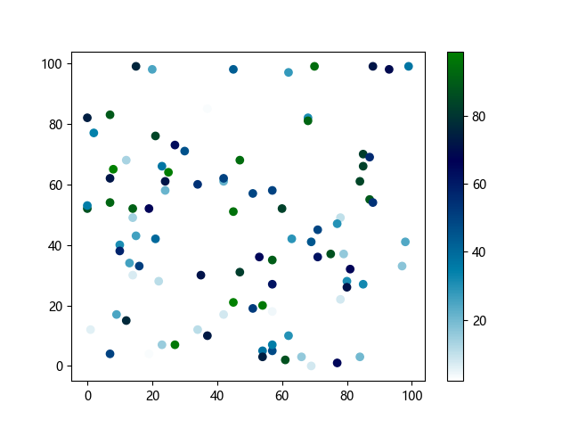 # 这三行代码使编译器能够绘图: import sys import matplotlib matplotlib.use('Agg') import matplotlib.pyplot as plt import numpy as np # 生成随机数据点 x = np.random.randint(100, size=(100)) y = np.random.randint(100, size=(100)) colors = np.random.randint(100, size=(100)) # 使用 ocean_r 配色方案绘制海洋色反向渐变色散点图: plt.scatter(x, y, c=colors, cmap='ocean_r') plt.colorbar() plt.show() # 这两行代码使编译器能够输出图形: plt.savefig(sys.stdout.buffer) sys.stdout.flush()
