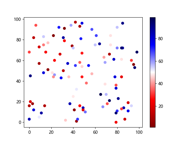 # 以下三行代码使编译器支持绘图功能: import sys import matplotlib matplotlib.use('Agg') import matplotlib.pyplot as plt import numpy as np # 生成随机数据: x = np.random.randint(100, size=(100)) y = np.random.randint(100, size=(100)) colors = np.random.randint(100, size=(100)) # 使用 seismic 反向配色方案创建散点图: plt.scatter(x, y, c=colors, cmap='seismic_r') plt.colorbar() plt.show() # 以下两行代码使编译器能够输出图形: plt.savefig(sys.stdout.buffer) sys.stdout.flush()