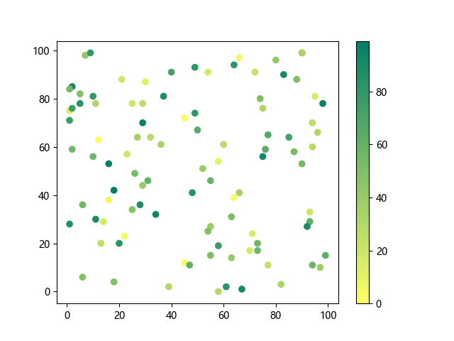# 以下三行代码使编译器支持绘图功能: import sys import matplotlib matplotlib.use('Agg') import matplotlib.pyplot as plt import numpy as np # 生成随机数据: x = np.random.randint(100, size=(100)) y = np.random.randint(100, size=(100)) colors = np.random.randint(100, size=(100)) # 使用 summer 反向配色方案创建散点图: plt.scatter(x, y, c=colors, cmap='summer_r') plt.colorbar() plt.show() # 以下两行代码使编译器能够输出图形: plt.savefig(sys.stdout.buffer) sys.stdout.flush()