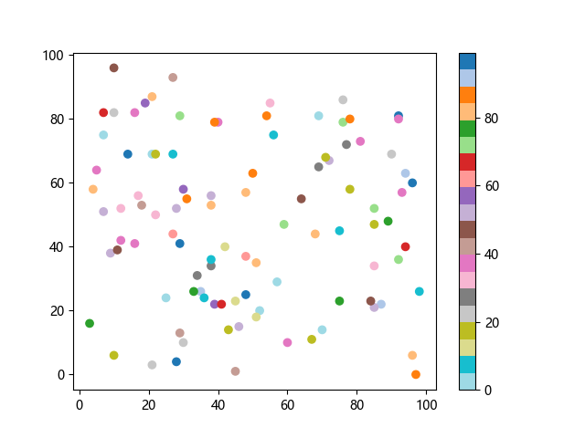 # 以下三行代码使编译器支持绘图功能: import sys import matplotlib matplotlib.use('Agg') import matplotlib.pyplot as plt import numpy as np # 生成随机数据: x = np.random.randint(100, size=(100)) y = np.random.randint(100, size=(100)) colors = np.random.randint(100, size=(100)) # 使用 tab20 反向离散配色方案创建散点图: plt.scatter(x, y, c=colors, cmap='tab20_r') plt.colorbar() plt.show() # 以下两行代码使编译器能够输出图形: plt.savefig(sys.stdout.buffer) sys.stdout.flush()
