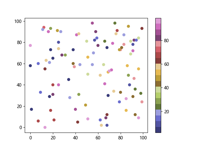 # 以下三行代码使编译器支持绘图功能: import sys import matplotlib matplotlib.use('Agg') import matplotlib.pyplot as plt import numpy as np # 生成随机数据: x = np.random.randint(100, size=(100)) y = np.random.randint(100, size=(100)) colors = np.random.randint(100, size=(100)) # 使用 tab20b 离散配色方案创建散点图: plt.scatter(x, y, c=colors, cmap='tab20b') plt.colorbar() plt.show() # 以下两行代码使编译器能够输出图形: plt.savefig(sys.stdout.buffer) sys.stdout.flush()