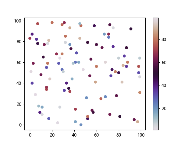 # 以下三行代码使编译器支持绘图功能: import sys import matplotlib matplotlib.use('Agg') import matplotlib.pyplot as plt import numpy as np # 生成随机数据: x = np.random.randint(100, size=(100)) y = np.random.randint(100, size=(100)) colors = np.random.randint(100, size=(100)) # 使用 twilight 配色方案创建散点图: plt.scatter(x, y, c=colors, cmap='twilight') plt.colorbar() plt.show() # 以下两行代码使编译器能够输出图形: plt.savefig(sys.stdout.buffer) sys.stdout.flush()