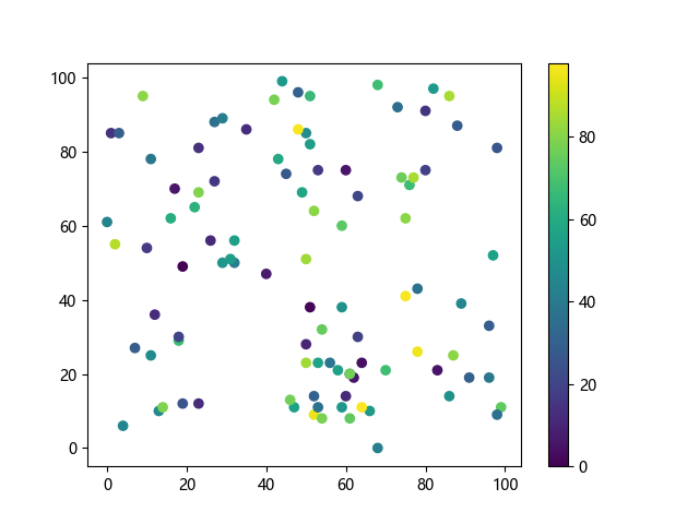 # 以下三行代码使编译器支持绘图功能: import sys import matplotlib matplotlib.use('Agg') import matplotlib.pyplot as plt import numpy as np # 生成随机数据: x = np.random.randint(100, size=(100)) y = np.random.randint(100, size=(100)) colors = np.random.randint(100, size=(100)) # 使用 viridis 配色方案创建散点图: plt.scatter(x, y, c=colors, cmap='viridis') plt.colorbar() plt.show() # 以下两行代码使编译器能够输出图形: plt.savefig(sys.stdout.buffer) sys.stdout.flush()