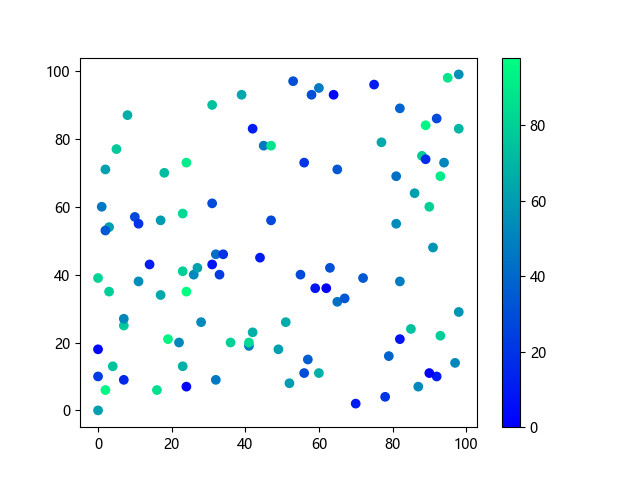 # 以下三行代码使编译器支持绘图功能: import sys import matplotlib matplotlib.use('Agg') import matplotlib.pyplot as plt import numpy as np # 生成随机数据: x = np.random.randint(100, size=(100)) y = np.random.randint(100, size=(100)) colors = np.random.randint(100, size=(100)) # 使用冬季 (winter) 配色方案创建散点图: plt.scatter(x, y, c=colors, cmap='winter') plt.colorbar() plt.show() # 以下两行代码使编译器能够输出图形: plt.savefig(sys.stdout.buffer) sys.stdout.flush()
