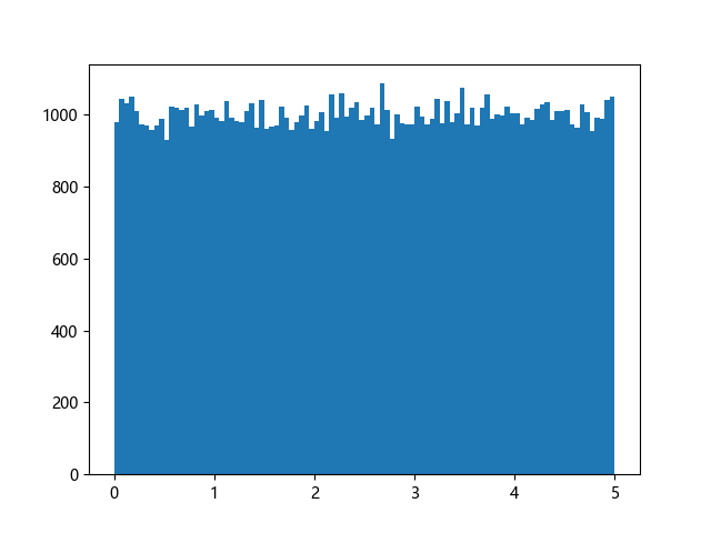 # 使编译器支持绘图的三行配置: import sys import matplotlib matplotlib.use('Agg') import numpy import matplotlib.pyplot as plt x = numpy.random.uniform(0.0, 5.0, 100000) plt.hist(x, 100) plt.show() # 实现编译器绘图功能的两行代码: plt.savefig(sys.stdout.buffer) sys.stdout.flush()