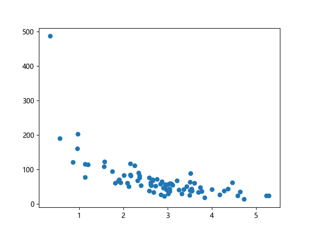 # 三行配置使编译器支持绘图功能: import sys import matplotlib matplotlib.use('Agg') import numpy import matplotlib.pyplot as plt numpy.random.seed(2) # 生成随机数据: x = numpy.random.normal(3, 1, 100) # 均值=3,标准差=1 y = numpy.random.normal(150, 40, 100) / x # 均值=150,标准差=40 # 划分训练集和测试集: # 前 80 个样本作为训练集: train_x = x[:80] train_y = y[:80] # 后 20 个样本作为测试集: test_x = x[80:] test_y = y[80:] # 绘制训练集散点图: plt.scatter(train_x, train_y) plt.show() # 两行代码实现图形输出: plt.savefig(sys.stdout.buffer) sys.stdout.flush()