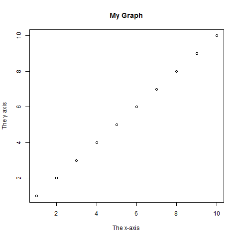 # 我们需要这行代码来在我们的编译器中显示图形 png(filename="output.png") # 绘制从 1 到 10 的图形,并设置标题为“My Graph”, # x 轴标签为“The x-axis”,y 轴标签为“The y axis” plot(1:10, main="My Graph", xlab="The x-axis", ylab="The y axis")