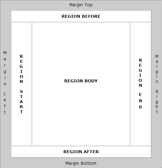 注释:region-before、region-after、region-start 以及 region-end 是主体区的一部分。为了避免主体区的文本覆盖到这些区域,主题区的边距至少要等于其他区的尺寸。